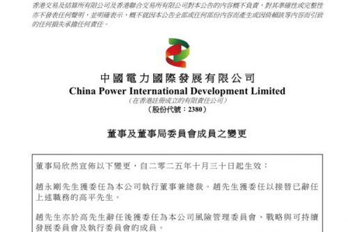 中国电力国际发展有限公司(简称:中国电力)近日公告称,由于其他工作安排,高平先生已辞任本公司执行董事、总裁,以及本公司风险管理委员会、战略与可持续发展委员会和执行委员会的成员职务,自2025年10月30日起生效。 自2025年10月30日起,赵永刚先生获委任为本公司执行董事兼总裁以接替高先生之职务。与此同时,赵先生已获委任接替高先生辞任后本公司风险管理委员会、战略与可持续发展委员