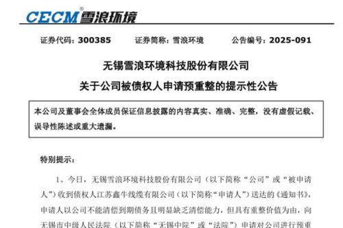 无锡雪浪环境科技股份有限公司(简称:雪浪环境)近日公告称,公司收到了债权人江苏鑫牛线缆有限公司(下称“申请人”)送达的《通知书》,申请人以公司不能清偿到期债务且明显缺乏清偿能力,但具有重整价值为由,向无锡市中级人民法院(下称“无锡中院”)申请对公司进行预重整。 截至本公告披露日,雪浪环境尚未收到法院受理本次预重整的文件,申请人的申请