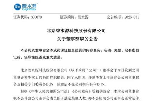 北京碧水源科技股份有限公司(简称:碧水源)公告称,近日,公司董事会收到董事许爱华女士的书面辞职报告,因个人原因,许爱华女士申请辞去公司董事职务及相关专门委员会职务,辞职后不在公司担任任何职务。其原定任期届满日为2027年4月1日。 碧水源表示,截至本公告披露日,许爱华女士未持有公司股份。许爱华女士在公司担任董事期间勤勉尽责,为公司规范运作发挥了积极作用,公司及董事会对许爱华女士为