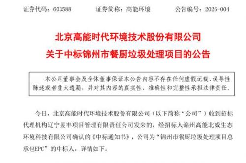 北京高能时代环境技术股份有限公司(简称:高能环境)近日公告称,公司已收到招标代理机构辽宁昱丰项目管理有限责任公司发来的,经招标人锦州高能北威生态环境科技有限公司确认的《中标通知书》,公司为“锦州市餐厨垃圾处理项目总承包EPC”的中标人。 1、项目名称:辽宁省锦州市餐厨垃圾处理项目总承包EPC 2、中标人名称:北京高能时代环境技术股份有限公司&