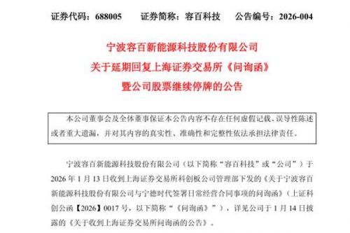 1月13日,就在刚刚披露与宁德时代新能源科技股份有限公司(下称“宁德时代”)签订了一份总销售金额预计超过1200亿元的《磷酸铁锂正极材料采购合作协议》后,宁波容百新能源科技股份有限公司(简称:容百科技)收到上海证券交易所科创板公司管理部下发的上证科创公函【2026】0017 号《关于宁波容百新能源科技股份有限公司与宁德时代签署日常经营合同事项的问询函》。其中,要求容百科