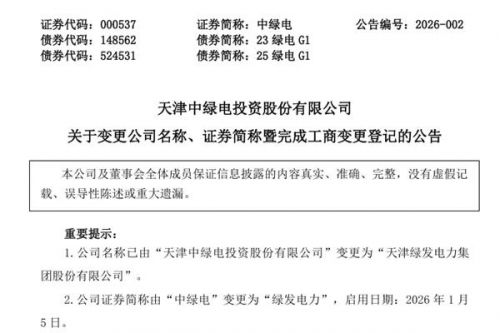 天津中绿电投资股份有限公司(简称:绿发电力)近日公告称,公司名称已由“天津中绿电投资股份有限公司”变更为“天津绿发电力集团股份有限公司”;证券简称由“中绿电”变更为“绿发电力”,启用日期:2026年1月5日;证券代码“000537”保持不变。 图源:绿发电力公告&n