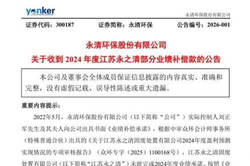 近日,永清环保股份有限公司(简称:永清环保)公告称,公司已收到2024年度江苏永之清固废处置有限公司(下称“江苏永之清”)部分业绩补偿款2600万元。此次补偿源于公司实控人刘正军及其夫人此前出具的业绩承诺,因江苏永之清未完成2024年度业绩目标,二人需向公司合计补偿7322.62万元。 公告披露,2022年5月,永清环保实际控制人刘正军及其夫人向公司出具书