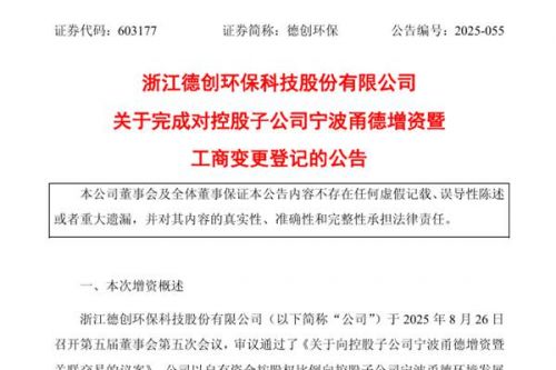 浙江德创环保科技股份有限公司(简称:德创环保)公告称,公司向控股子公司宁波甬德环境发展有限公司(下称“宁波甬德”)增资40,584,000元事项已完成。截至目前,宁波甬德完成工商变更登记备案手续,并取得了宁波市鄞州区市场监督管理局换发的《营业执照》。 本次增资完成后,宁波甬德注册资本由8000万元增加到14764万元,股东持股比例保持不变,德创环保持有60