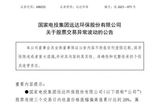 国家电投集团远达环保股份有限公司(简称:远达环保)公告称,公司股票于2025年11月5日至11月7日连续3个交易日股票交易价格涨幅累计达20.86%,短期内股价波动较大,可能存在短期涨幅较大后的下跌风险。公司所属证监会行业大类为“生态环保和环境治理业”,根据万得金融终端数据显示,截至2025年11月7日公司最新滚动市盈率为3,635.42倍,行业最新滚动市盈率为91.6