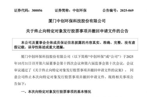 厦门中创环保科技股份有限公司(简称:中创环保)公告称,公司于2025年10月31日召开第六届董事会第十四次会议和第六届监事会第十次会议,会议审议通过了《关于终止向特定对象发行股票事项并撤回申请文件的议案》, 同意公司终止本次向特定对象发行股票事项并撤回申请文件。至此,中创环保原计划易主邢台潇帆科技有限公司(下称“邢台潇帆”)事项正式宣告落空。邢台潇帆实际控制人为胡郁,是