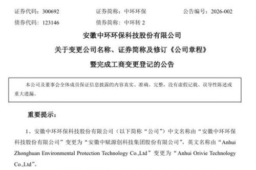 安徽中环环保科技股份有限公司(简称:中环环保)公告称,公司中文名称由“安徽中环环保科技股份有限公司”变更为“安徽中赋源创科技集团股份有限公司”,英文名称由“AnhuiZhonghuan Environmental Protection Technology Co.,Ltd”变更为“Anhui Orivie Te