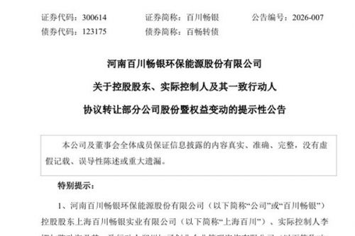 近日,河南百川畅银环保能源股份有限公司(简称:百川畅银)发布公告,宣布公司控股股东上海百川畅银实业有限公司、实际控制人李娜与陈功海及其一致行动人郑州知了创业企业管理咨询有限公司与江苏能源物资有限公司签署了《股份转让协议》,上海百川、知了创业、李娜拟通过协议转让方式以人民币12.68元/股的价格将其合计持有的公司16,044,067股无限售流通股转让给江苏能源,占公司总股本的10.00%,股份转