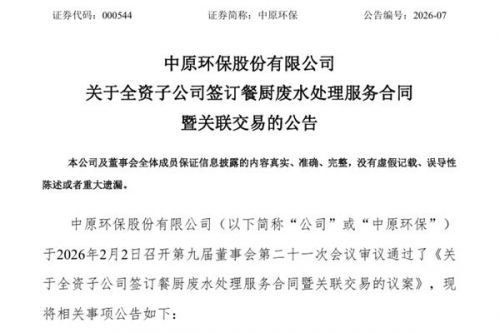 中原环保股份有限公司(简称:中原环保)公告称,公司全资子公司郑州市污水净化有限公司(下称“净化公司”)拟与控股股东下属全资子公司郑州公用环境科技有限公司(下称“公用环境”)签订餐厨废水处理服务合同。公用环境负责投资建设维护餐厨废水输送管线,供应其郑州市东部餐厨垃圾处理项目产生的高浓度有机废水,净化公司所运营的郑州新区污水处理厂负责对东部餐厨废水进