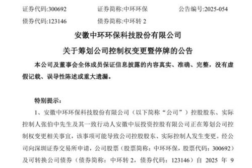 安徽中环环保科技股份有限公司(简称:中环环保)近日公告称,公司控股股东、实际控制人张伯中先生及其一致行动人安徽中辰投资控股有限公司正在筹划公司控制权变更相关事宜,该事项可能导致公司控股股东、实际控制人发生变更。经公司向深圳证券交易所申请,公司股票(股票简称:中环环保)及可转换公司债券(债券简称:中环转2)自2025年9月29日(星期一)开市起停牌,预计停牌时间不超过2个交易日。公司可转换公司债