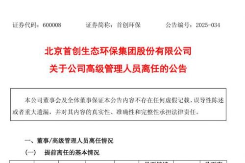 北京首创生态环保集团股份有限公司(简称:首创环保)公告称,9月29日,因高管团队调整,公司副总经理邢俊义离任,不继续在公司及控股子公司任职,原定任期到期为日2027年2月25日。 图源:首创环保公告 首创环保表示,根据公司经营管理需要,对高级管理人员进行调整并已对相关工作做出妥善安排,邢俊义先生的离任不会影响公司的正常生产经营。截至本公告日,邢俊义先生未持股公司股份,不