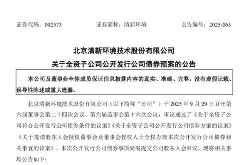 北京清新环境技术股份有限公司(简称:清新环境)公告称,全资子公司四川发展国润水务投资有限公司(下称“国润水务”)将公开发行公司债券,规模不超过人民币20亿元(含20亿元),每张面值为人民币100元,按面值平价发行。 本次发行公司债券期限不超过5年(含5年),可以为单一期限品种,也可以为多种期限的混合品种。具体期限提请股东大会授权董事会及董事会授权人士根据公