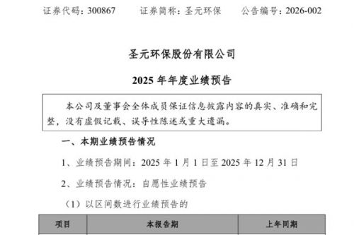 圣元环保股份有限公司(简称:圣元环保)近日发布《2025年年度业绩预告》。报告期内,圣元环保预计实现归属于上市公司股东的净利润为2.4亿元至2.9亿元,较上年同期增长31.79%至59.24%;预计2025年扣除非经常性损益后的净利润为2.45亿元至2.95亿元,较上年同期增长47.88%至78.06%。 图源:圣元环保公告 报告期内,圣元环保业绩变动主要系以下因素综合