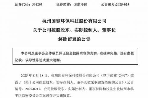 杭州国泰环保科技股份有限公司(简称:国泰环保)近日公告称,9月20日,公司收到陈柏校先生家属的通知,其收到杭州市临平区监察委员会出具的《解除留置通知书》,杭州市临平区监察委员会已解除对陈柏校先生的留置措施。目前陈柏校先生已能正常履职,董事、总经理夏玉坤先生不再代为履行公司法定代表人、董事长及董事会专门委员会委员等相关职责,公司生产经营情况正常。 据悉,8月18日,国泰环保披露了《