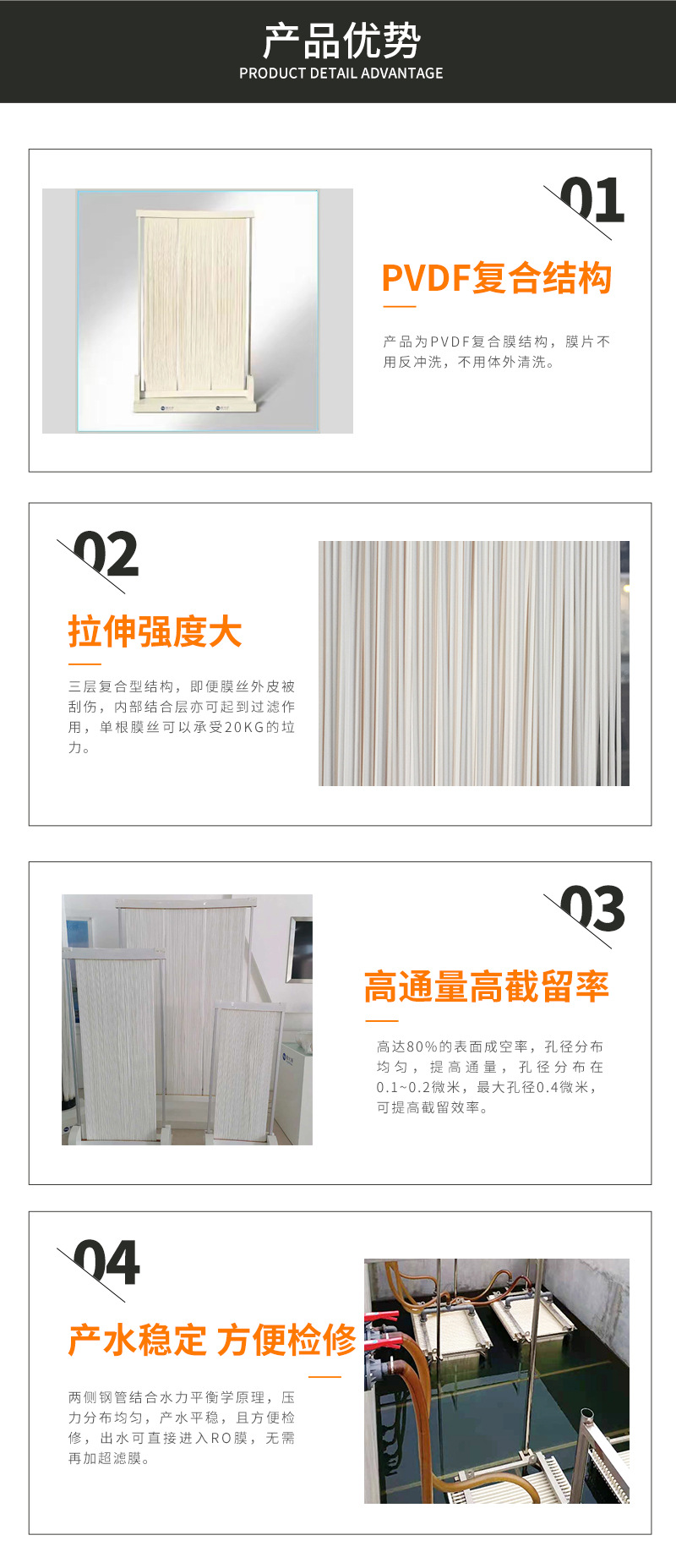 2、 采用更先进的一次成膜均相成孔工艺技术,膜孔径分布均匀,孔隙率高,单位面积膜出水通量大。